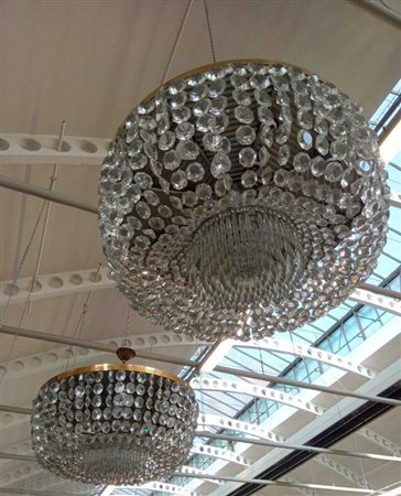 Coppia di lampadari circolari con struttura in ottone e gocce e pendenti in cristallo. Anni '70. (h cm 33; d cm 80) (lievi difetti)