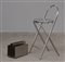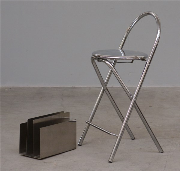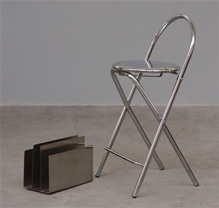 Lotto composto da un portariviste, in acciaio di Bebo De Marco, produzione Robert Design, Milano secolo XXI unito a uno sgabello in metallo cromato. Italia, secolo XX. (portariviste cm 33x23x17; sgabello cm 42x87x41) (lievi difetti)