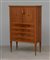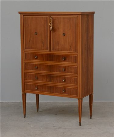 Mobile bar in legno massello impiallacciato e profilato a due antine e quattro cassetti, gambe troncoconiche, piedini in ottone, interno rivestito a specchio, piano superiore in vetro retroverniciato. Italia, anni '50. (cm 92,5x146x40) (lievi difetti)