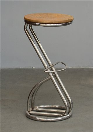 Sgabello con struttura in tubolare metallico, seduta in legno impiallacciato. Italia, secolo XX. (h cm 73; d cm 35) (difetti)