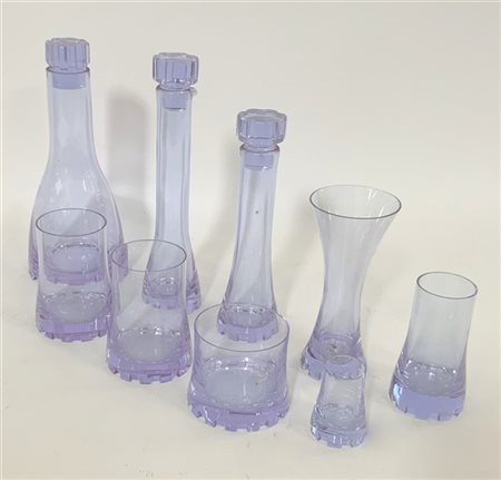 Lotto composto da tre bottiglie con tappi, un vasetto e cinque bicchieri di capienze differenti in vetro trasparente azzurro chiaro. Cecoslovacchia, anni '80/'90. (h max cm 25)