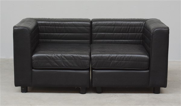 Divano componibile composto da due unità angolari imbottito e rivestito in similpelle nera. Italia, anni '70. (unità cm 77x70x75) (difetti)