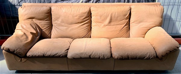 Divano a tre posti modello "Bonheur". Produzione Brunati, Italia, anni '70. Rivestimento in pelle marrone chiaro. Marcati sotto la base. (cm 227x80x90) (difetti)