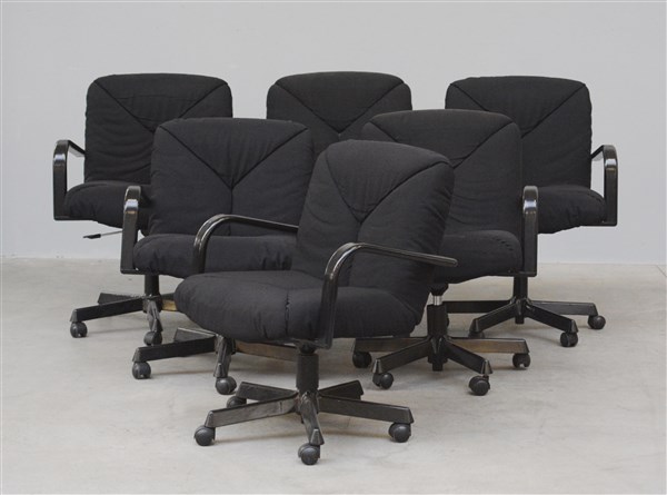 Lotto composto da sei poltrone girevoli da ufficio con struttura in metallo verniciato nero, seduta e schienale imbottiti e rivestiti in tessuto nero. Produzione ICF, Italia, anni '70. Recanti etichetta adesiva. (cm 65xaltezza regolabilex60) (difetti)
