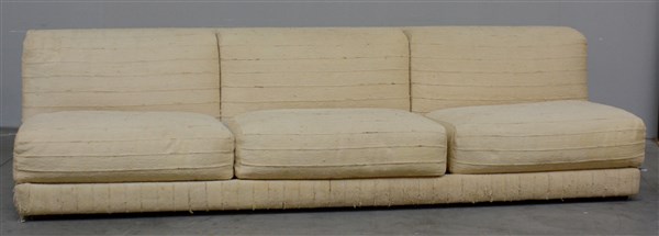 Divano a tre posti con seduta e schienale imbottiti e rivestiti in tessuto beige. Produzione Molli, Roma, anni '70/'80. (cm 281x72x98) (difetti)