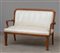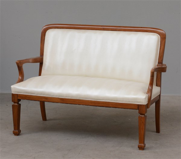 Divanetto a due posti con struttura in legno massello, seduta e schienale imbottiti e rivestiti in finta pelle bianca. Italia, inizio secolo XX. (cm 138x99x60) (lievi difetti e restauri)