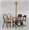 Lotto composto da una sedia, uno sgabello e una poltrona marcati sotto la base Thonet, uniti a un attaccapanni e una poltrona girevole in legno di faggio curvato al vapore. Vienna, prima metà secolo XX. (misure diverse) (difetti)