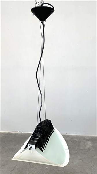 Lampada a sospensione modello "Greta". Varese, anni '80. Struttura in plastica, vetro acidato, metallo verniciato nero. (diffusore cm 100x37x50) (lievi difetti)