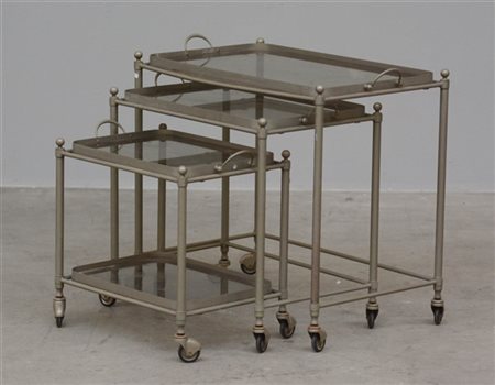 Lotto composto da tre carrellini impilabili in ottone verniciato grigio, piani