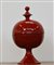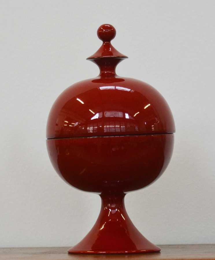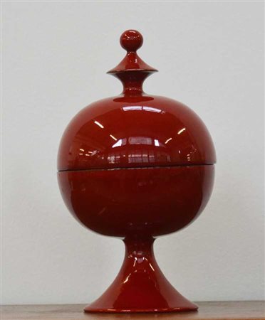 Coppa con coperchio in ceramica smaltata sotto vetrina nei toni del rosso. Italia, secolo XX. Recante etichetta adesiva alla base. (h cm 26)