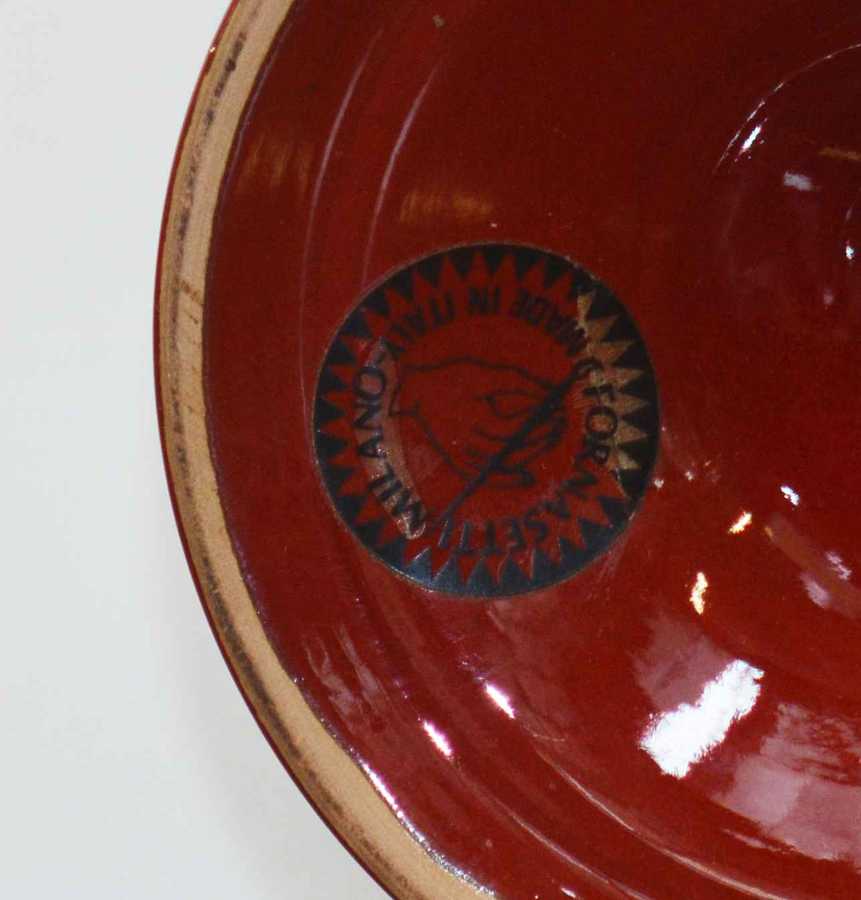 Coppa con coperchio in ceramica smaltata sotto vetrina nei toni del rosso. Ital