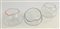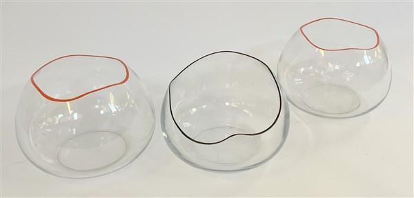 Gruppo di tre vasi di forma sferica in vetro trasparente incolore con orlo ross