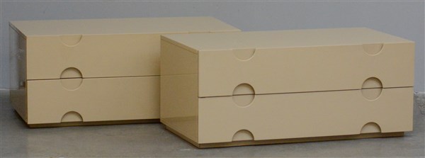 Coppia di cassettiere a due cassetti. Produzione Molli, Roma. Legno laccato beige. (cm 101x43x55) (difetti)
