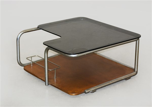 Tavolino-bar con struttura in metallo cromato, piano inferiore in legno con por