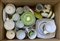 Cartone contenente diverse parti di servizi per la tavola in ceramica di epoche