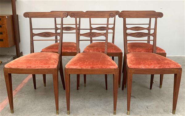 Lotto di sei sedie nello stile di Paolo Buffa in legno massello con schienale a giorno e seduta imbottita e rivestita in velluto marrone, puntali delle gambe anteriori in ottone. Cantù, anni '50. (cm 46x90x52) (lievi difetti e restauri)