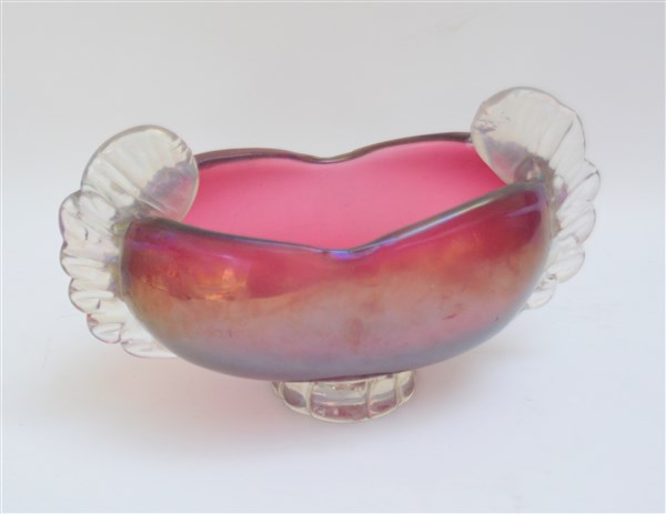 Vaso a morise in vetro soffiato color ametista chiaro iridato sulla superficie interna. Murano, anni '40/'50. (cm 37x22x16) (difetti)