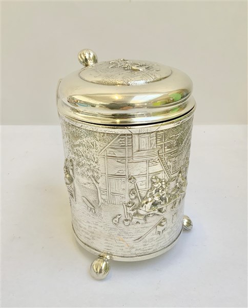 Boccale in metallo argentato sbalzato con scene di villaggio. 1930ca. Marcato "E. Dragsted made in Denmark". (h cm 16; d cm 12,5)