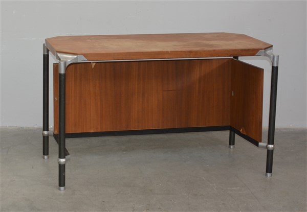 Scrittoio modello "Programma Urio". Roma, 1958. Piano rettangolare lastronato in legno di noce,struttura in metallo verniciato nero e alluminio pressofuso. (cm 120x73x60) (gravi difetti e mancanze)