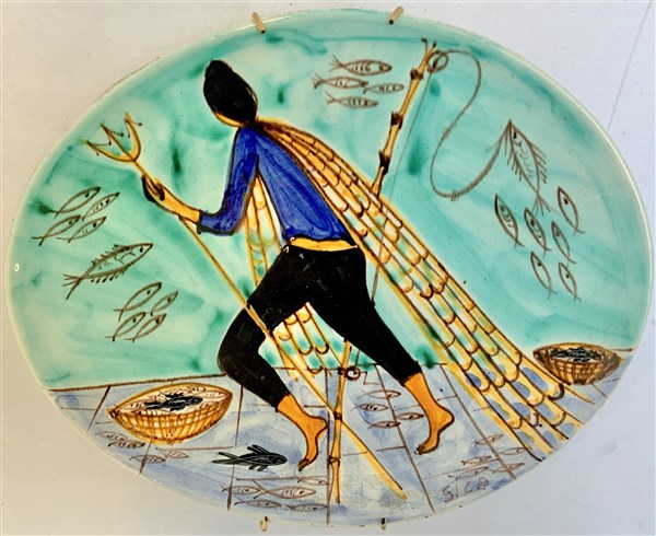 S.I.C.A. Piatto in ceramica smaltata raffigurante un pescatore. Faenza, anni '50