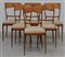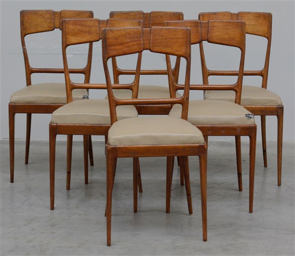Lotto composto da sei sedie con struttura in legno, schienale a giorno, seduta imbottita e rivestita in similpelle tortora. Italia, anni '50. (cm 43x90x48) (gravi difetti e mancanze)