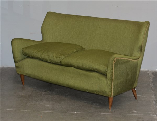Divanetto a posti imbottito e rivestito in tessuto verde, piedini troncoconici in legno. Italia, anni '50. (cm 145x80x70) (lievi difetti)