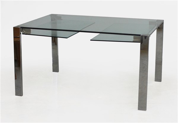 Tavolo allungabile modello "Livingstone". Produzione Tonelli Design, Italia, 2006. Piano in vetro temprato, gambe in acciaio cromato. (chiuso cm 140x74,5x96,5; aperto cm 240x74,5x96,5)