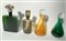 Lotto composto da quattro bottiglie di diverse forme in vetro verde, giallo e f