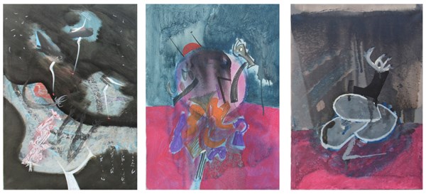 Sergio Dangelo Lotto di tre opere: "Rombo di tuono" olio su tela, cm 70x50, firm