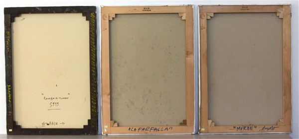 Lotto di tre opere: "Rombo di tuono" olio su tela, cm 70x50, firmato in basso al centro; firmato e titolato al retro. "La farfalla" olio su tela, cm 70x50, firmato in basso a destra e titolato al retro. "Morde" olio su tela, cm 70x50, firmato in basso a destra; firmato e titolato al retro