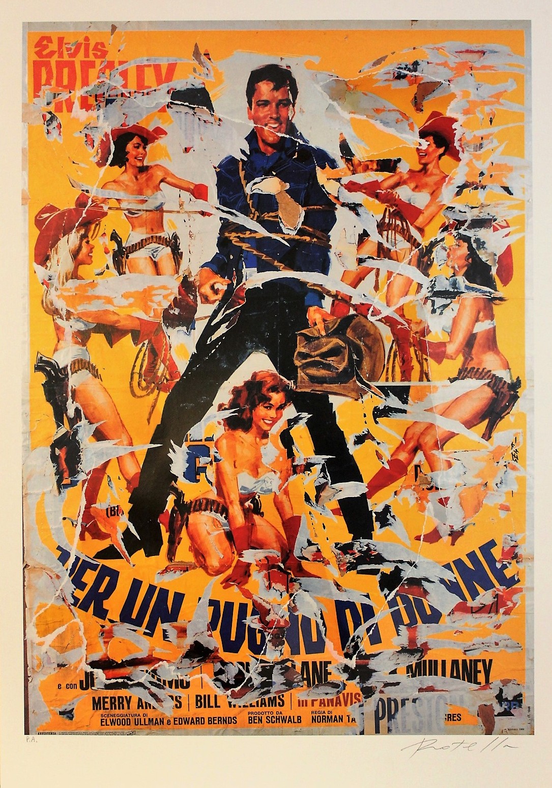 ROTELLA MIMMO Catanzaro 1918 – Milano 2006 "Per un pugno di donne" multiplo, serigrafia a colori dècollage cm 70x100. Firma in basso a destra e tiratura P.A in basso a sinistra.