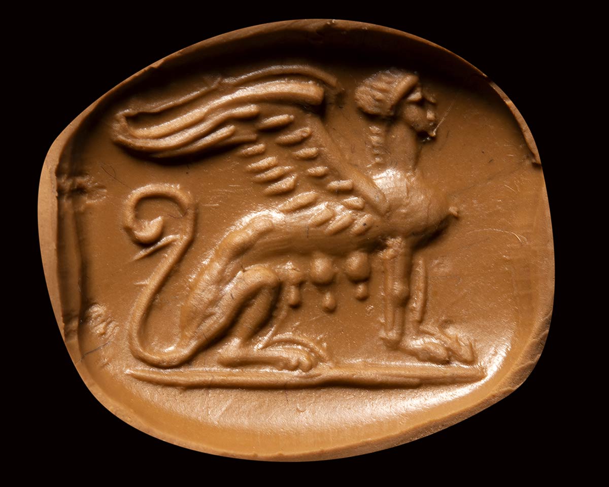 The ovoid seal is drilled lenghtwise. The sphinx is turned on the left, with large wings and three udders pending below her belly. Groundline. Wear marks. Rare.