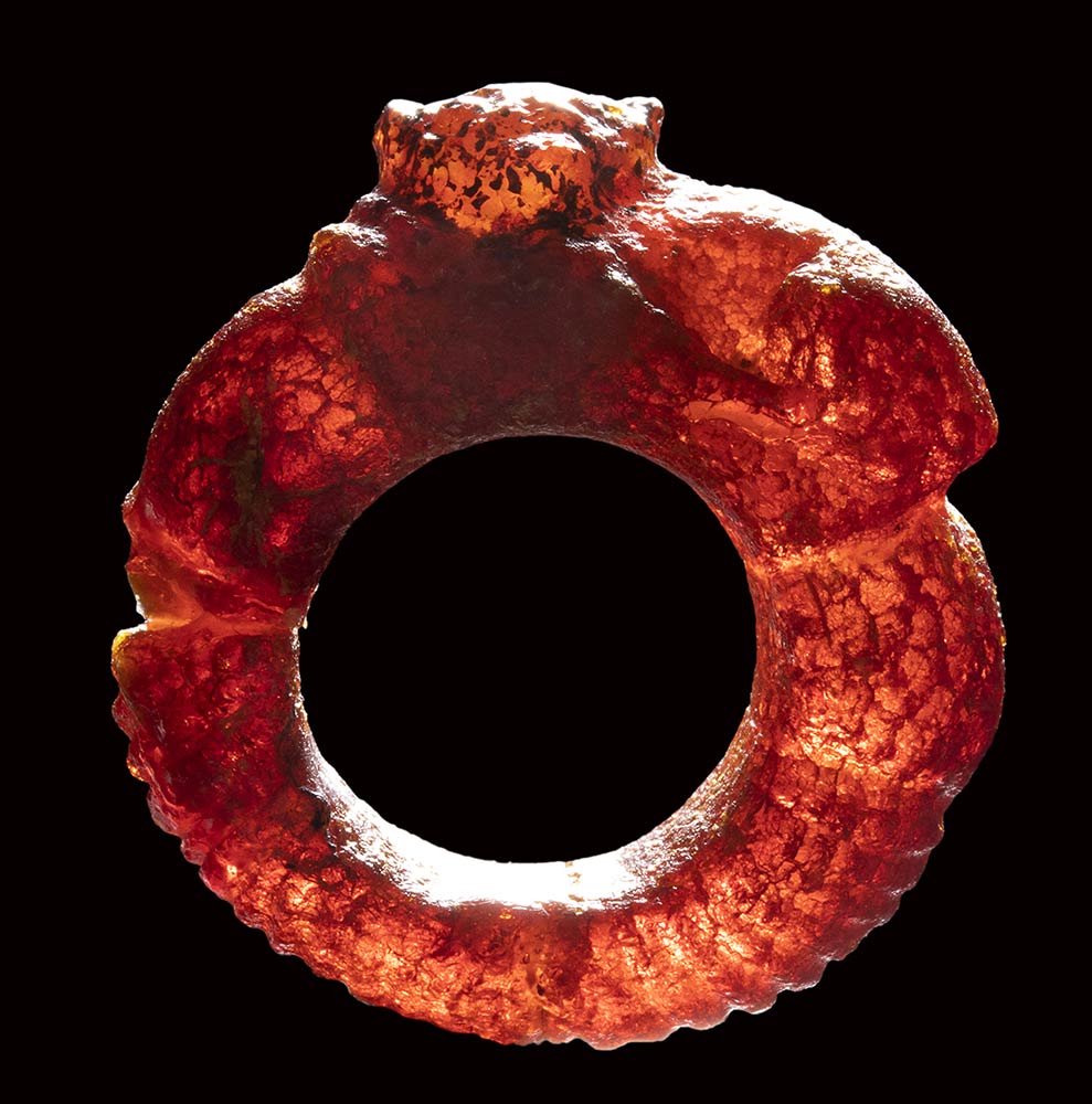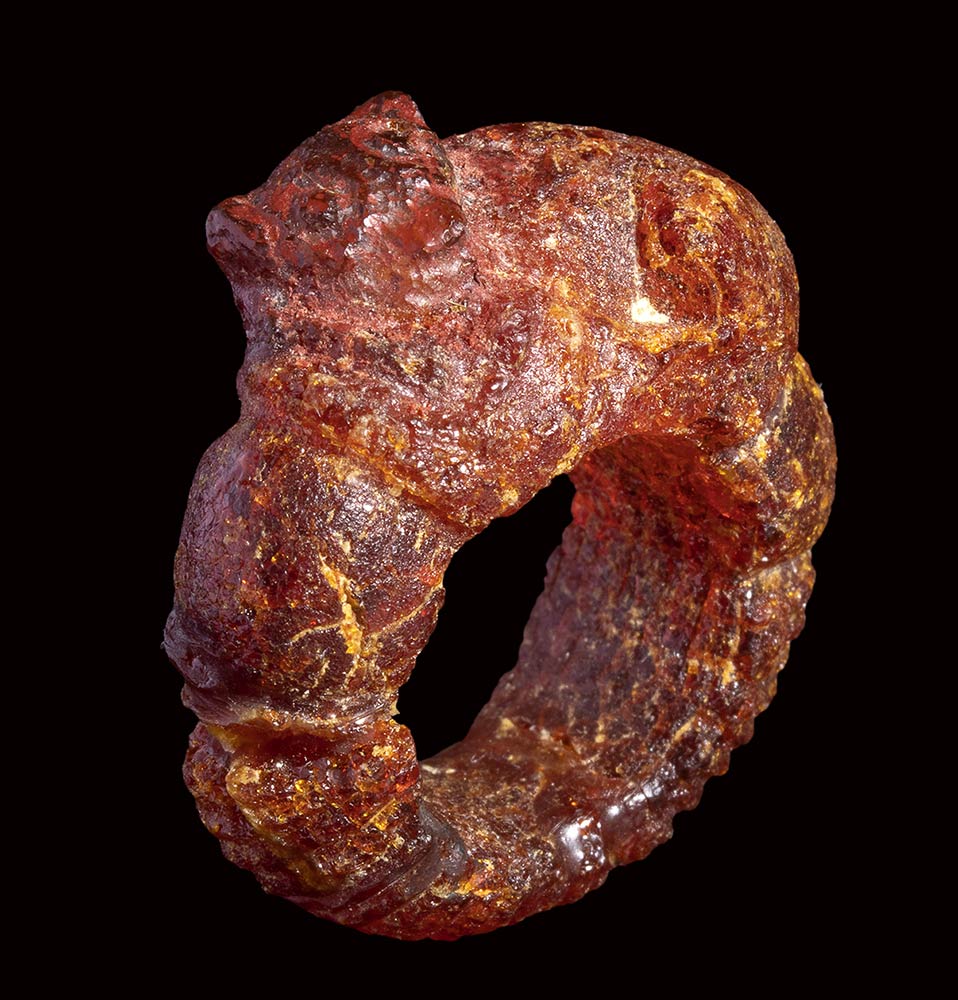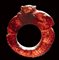 Ring shaped in a fine twist. The bezel in a form of a crouched lion. Nice dark red color, opaque on the surface.