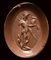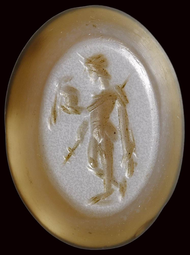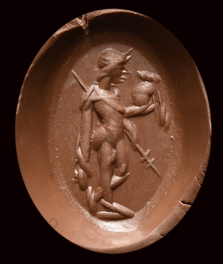 The figure facing left is wearing a cloak, holding the spear with his right hand, the helmet with his left. Groundline. Nice size and tone of the stone.
