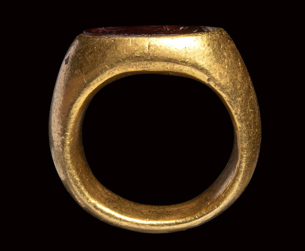 A large roman carnelian intaglio set in a gold ring. Bust of Athena.