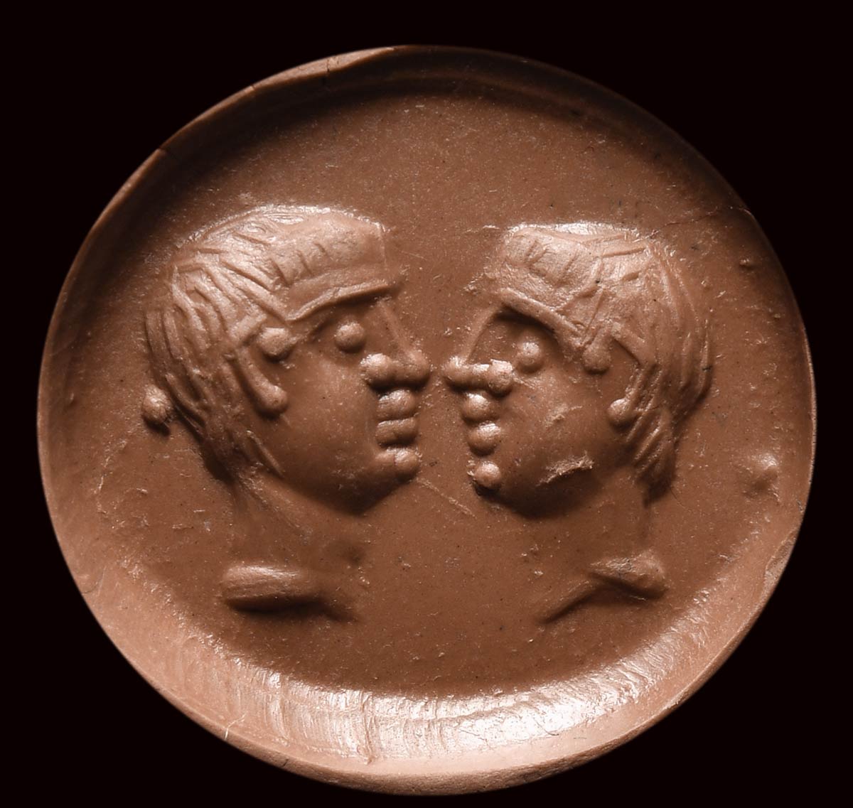 Two faced male busts of young characters, with short hair. Use of globular elements for the face's details ( eyes, nose, lips, chin, ears). Wear marks.