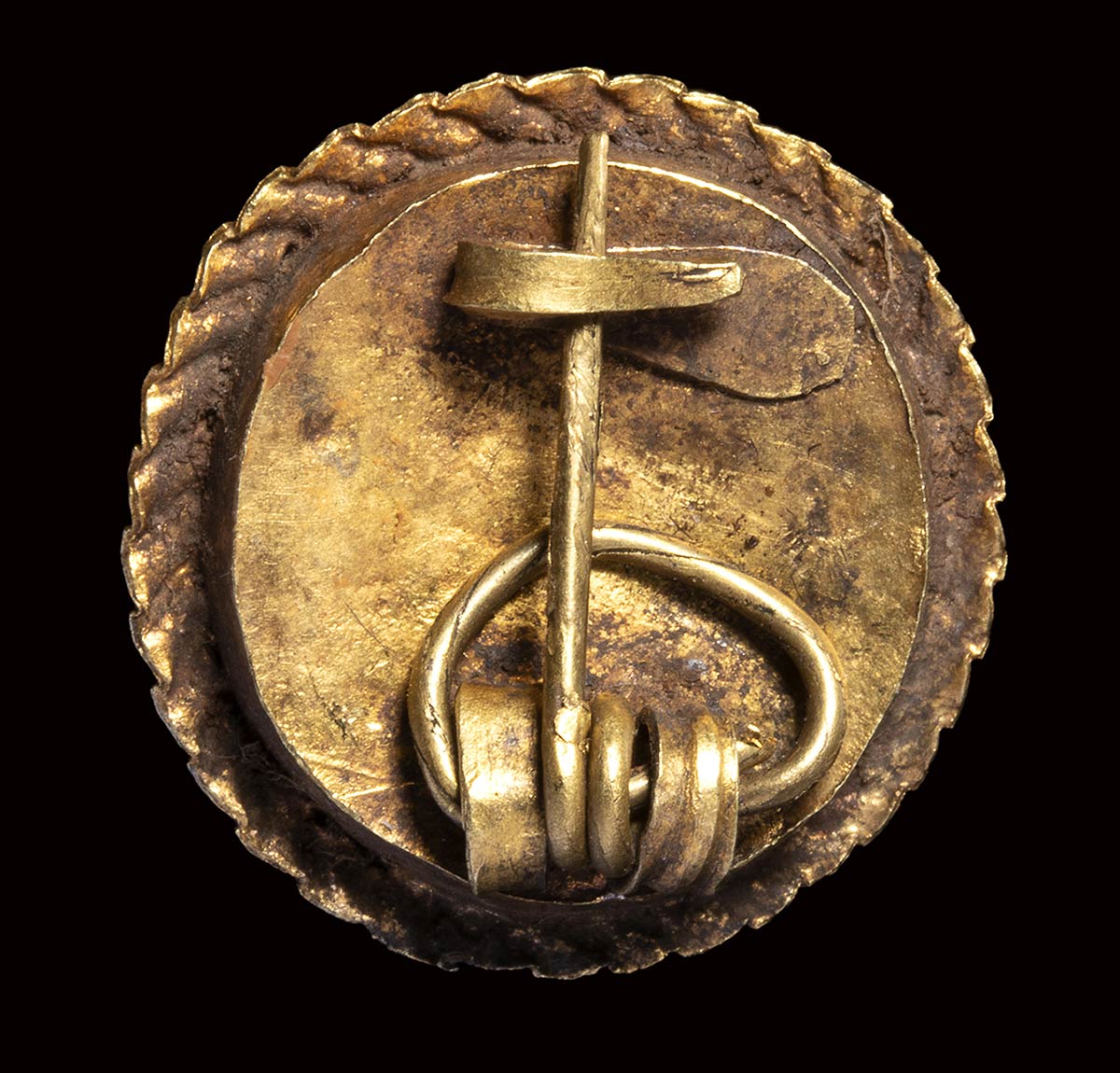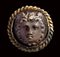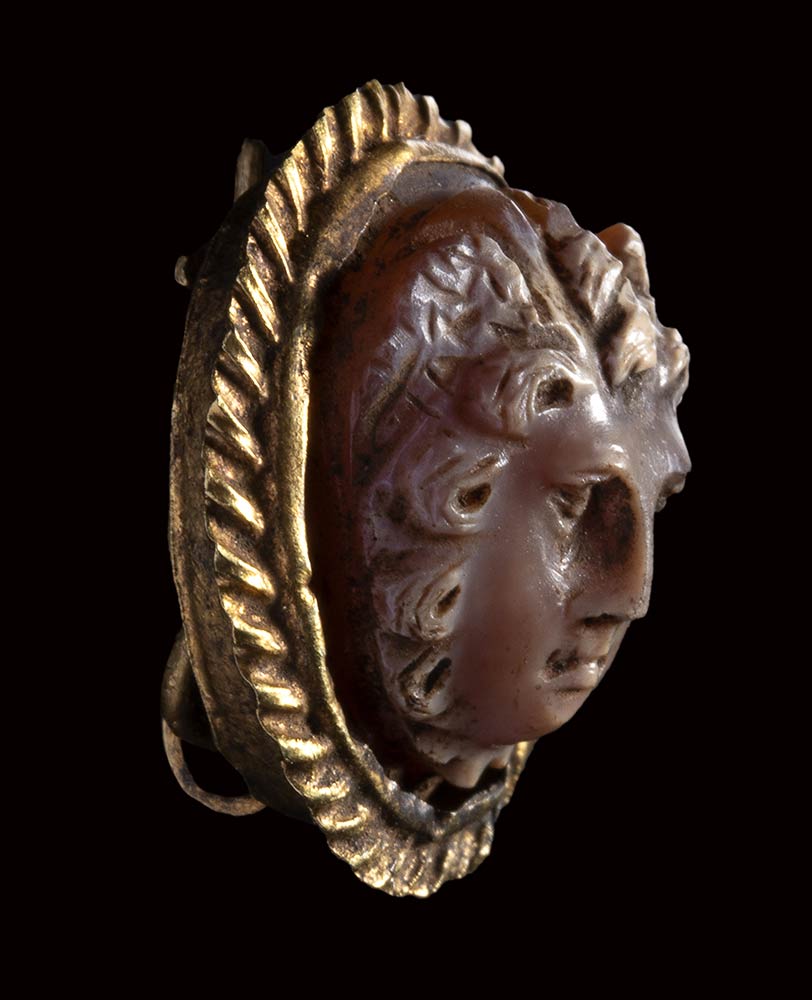 The front facing winged head of Medusa is depicted as a rounded face with thick hair. The stone, slightly burnt on the surface, was cutted in very high relief and mounted in a gold brooch. Wear marks. Intact specimen, rare in this fine condition.