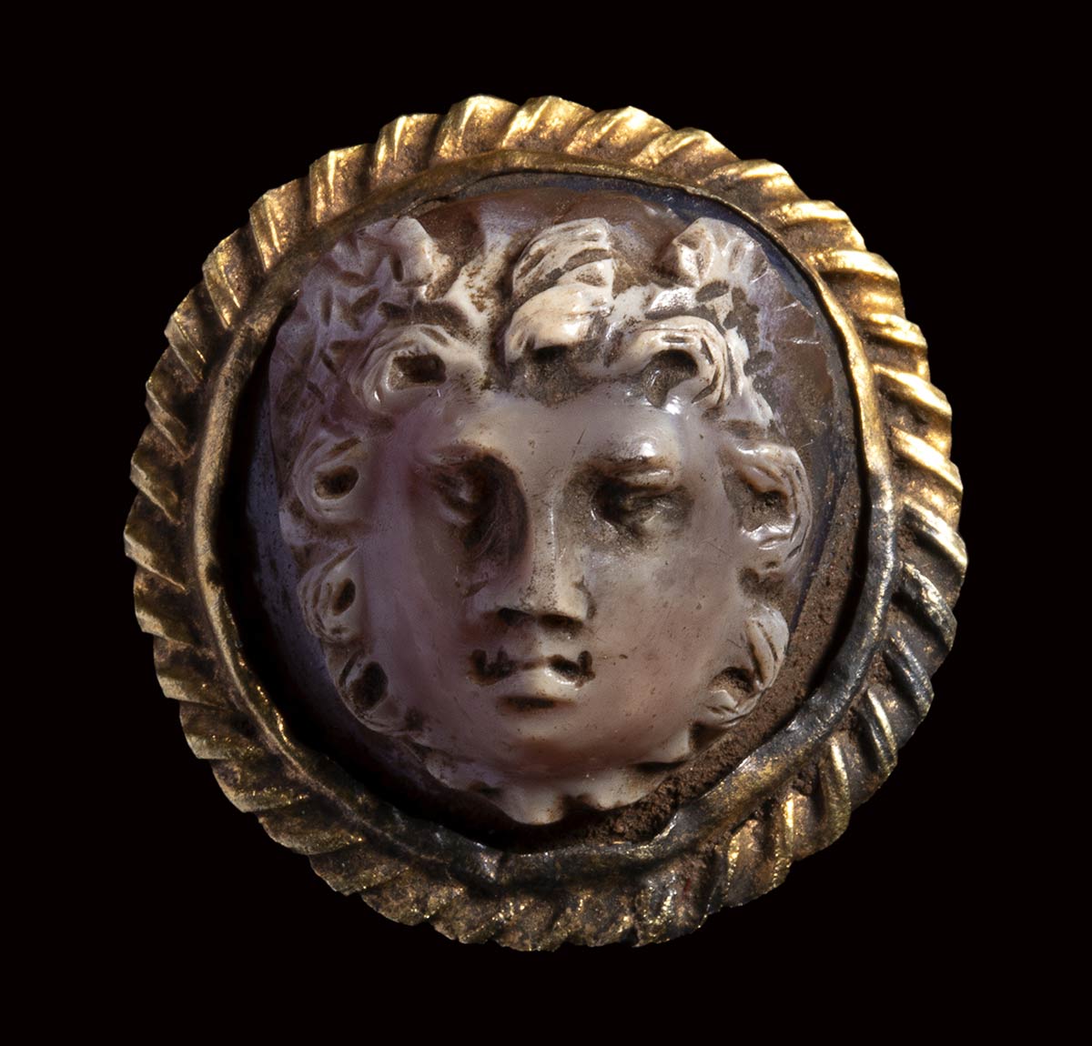A roman agate cameo mounted in an ancient gold brooch. Medusa mask.