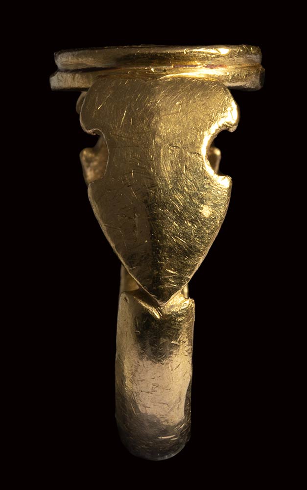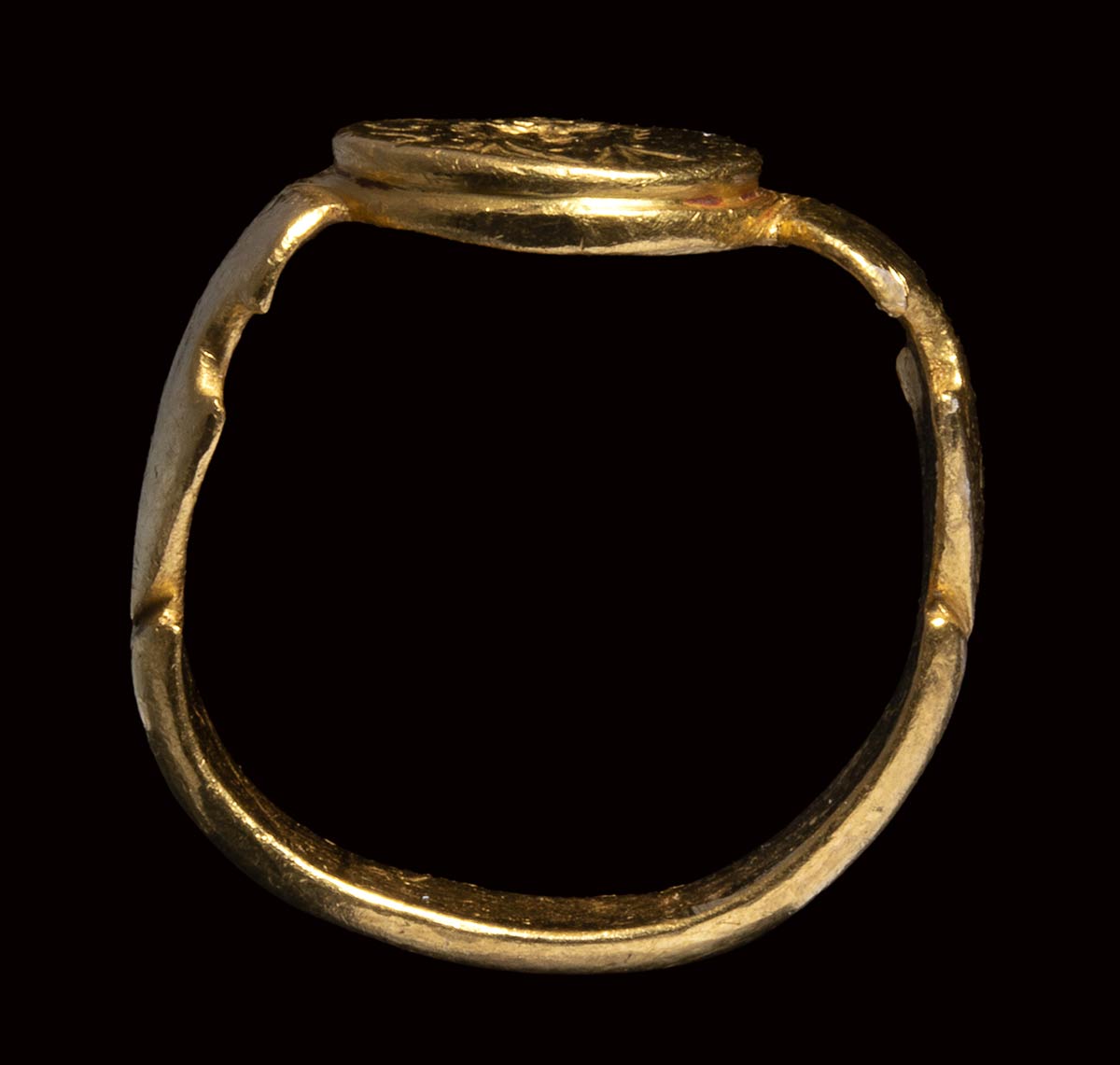 Flat hoop, slightly rounded without, with either shoulder cut into triangular form. Circular bezel, with engraved design representing the bust of draped woman. Inscriptions on the side (?).