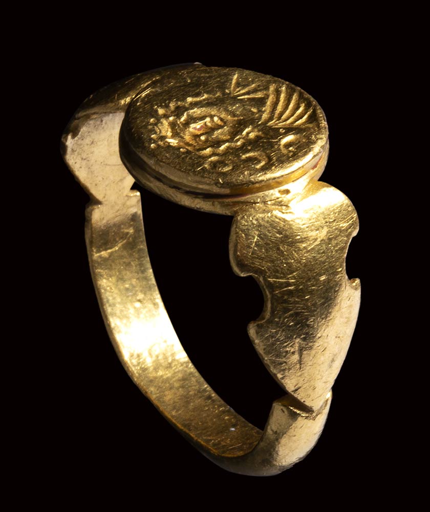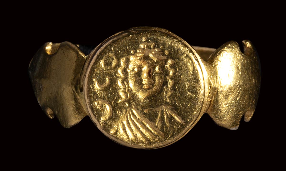 A late roman gold signet ring, with engraved bezel. Female bust with inscriptions.