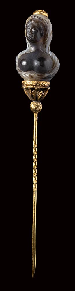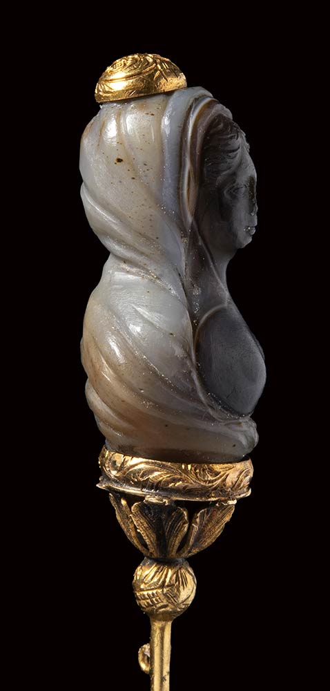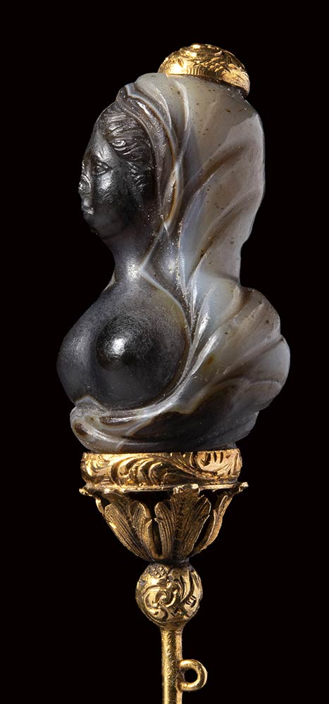The figure is characterized by a veiled head, partially draped torso with large exposed breasts. The bust is finely sculpted, emphasizing in the best way the beauty of this banded agate, engraving the body in the dark part and the drapery in the light part of the stone. The nose is damaged. This microsculpture is set in an elegant mounting adorned with plant motif, finely chiseled.