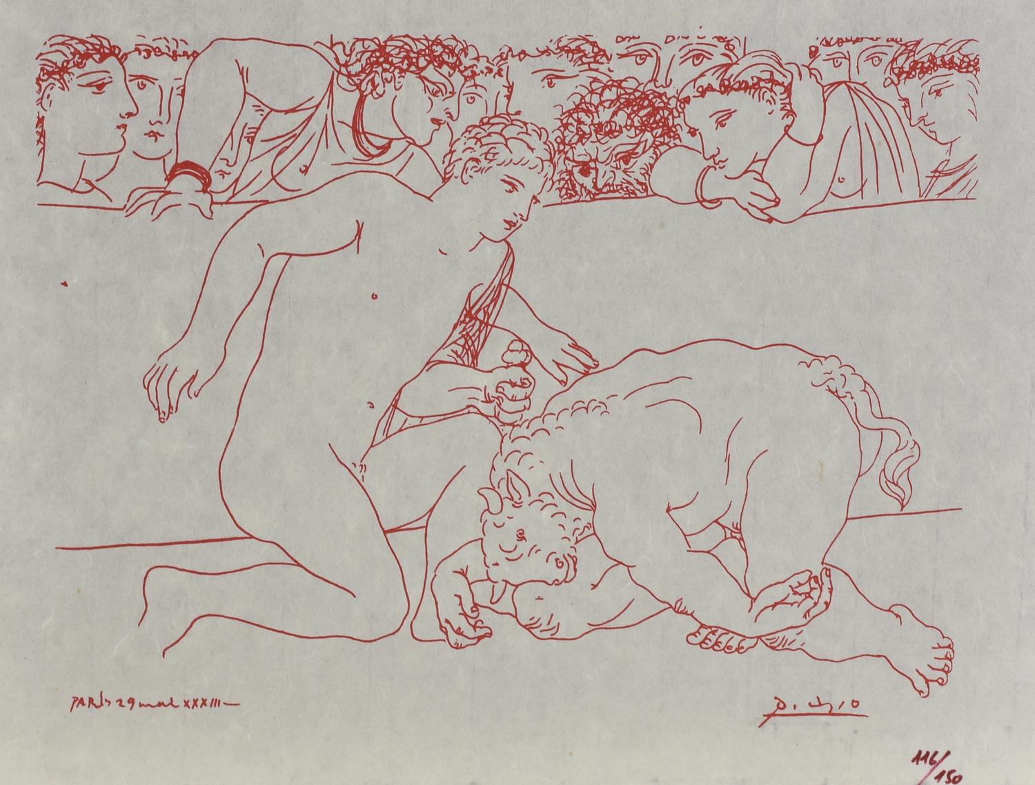 Pablo Picasso MINOTAURO NELL'ARENA litografia su carta di riso (d'apres), cm...