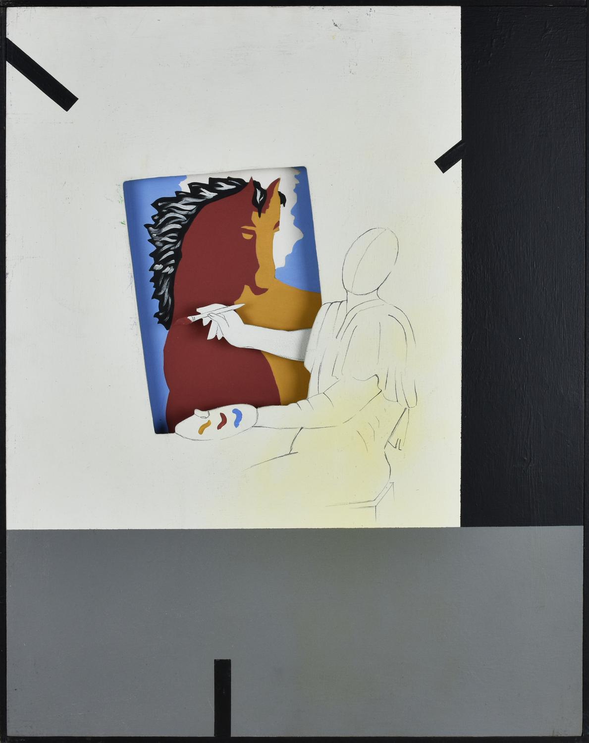 tecnica mista su compensato con meccanismo di orologio, cm 52x41x5,5
