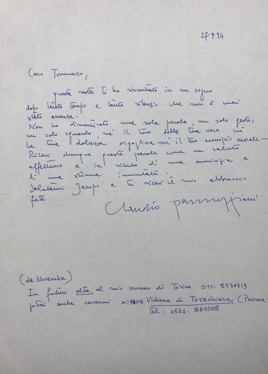 - Claudio Parmiggiani. Lettera autografa del 27/09/94 indirizzata a Tommaso Trini