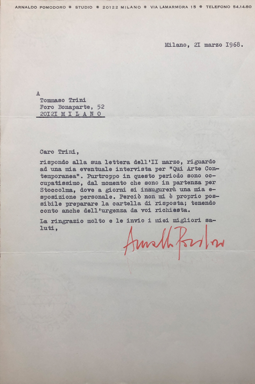 - Arnaldo Pomodoro. Lettera a macchina del 21/03/1968 su carta intestata e indirizzata a Tommaso Trini, recante firma a pennarello