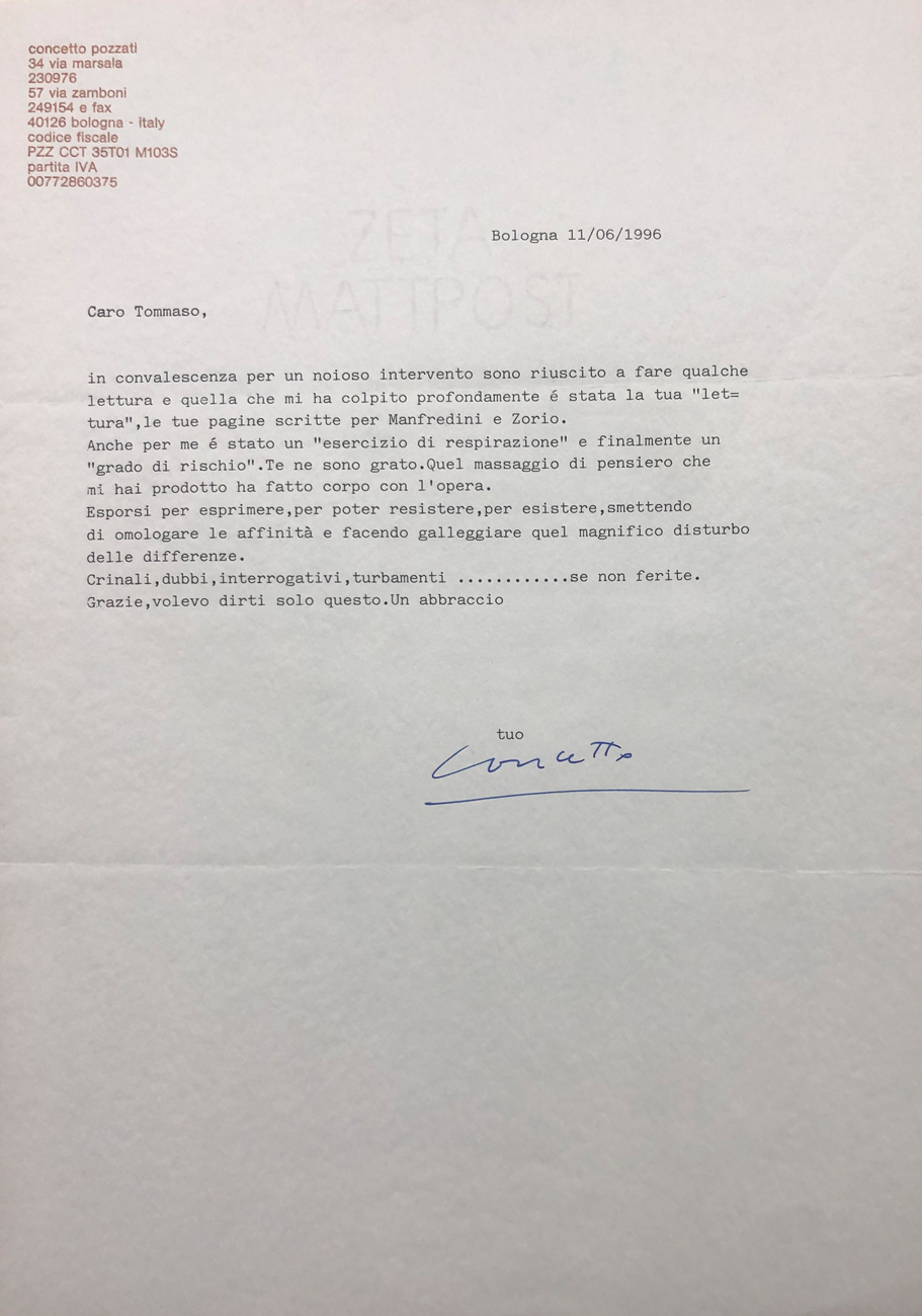 - Concetto Pozzati. Lettera a macchina dell'11/06/1996 su carta intestata e indirizzata a Tommaso Trini, recante firma a biro