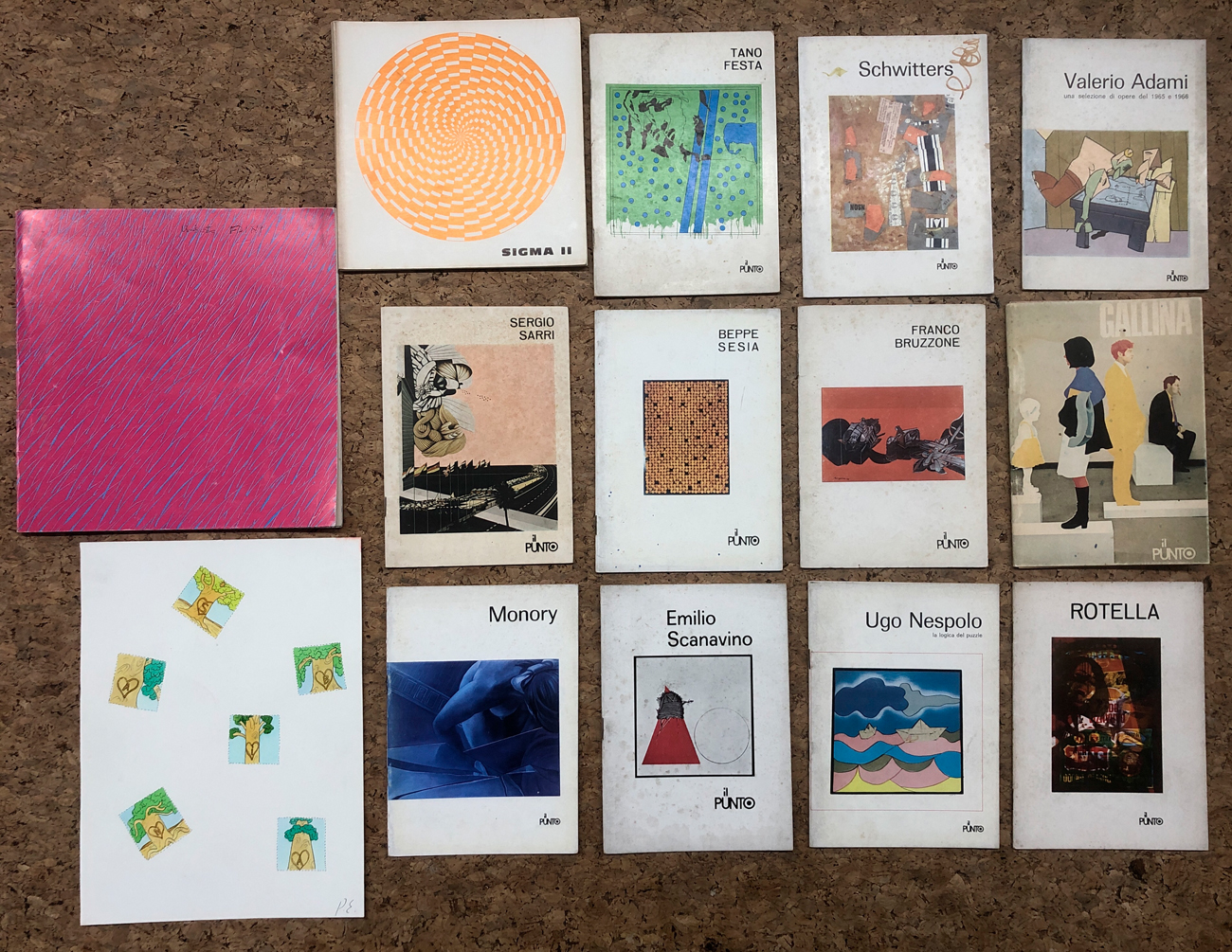 Lotto unico composto da 11 cataloghi editi dalla Galleria Il Punto di Genova e riferiti a mostre personali di Mimmo Rotella, Ugo Nespolo, Emilio Scanavino, Monory , Pietro Gallina, Franco Bruzzone e Beppe Sesia, Sergio Sarri, Valerio Adami, Kurt Schwitters e Tano Festa.