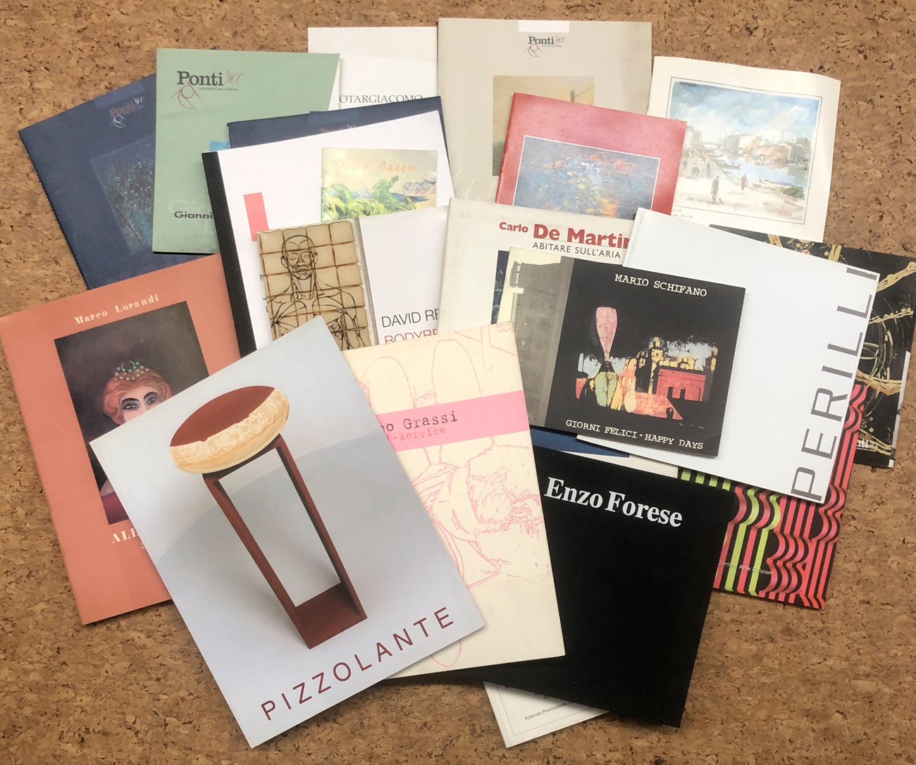 Lotto unico di numerosi cataloghi relativi ad esposizioni dei seguenti artisti: Mario Schifano, Achille Perilli, David Reimondo, Marco Grassi, Aldo Bergolli, Aldo Carpi, Enzo Forese (2), Dario Zaffaroni, Gian Carozzi, Carlo De Martino e Antonio Pizzolante, Aligi Sassu, Gianni Dova, Guga-Zunino, Aldo Pancheri, Mario Vergani, Mirko Pagliacci, Alberto Martini