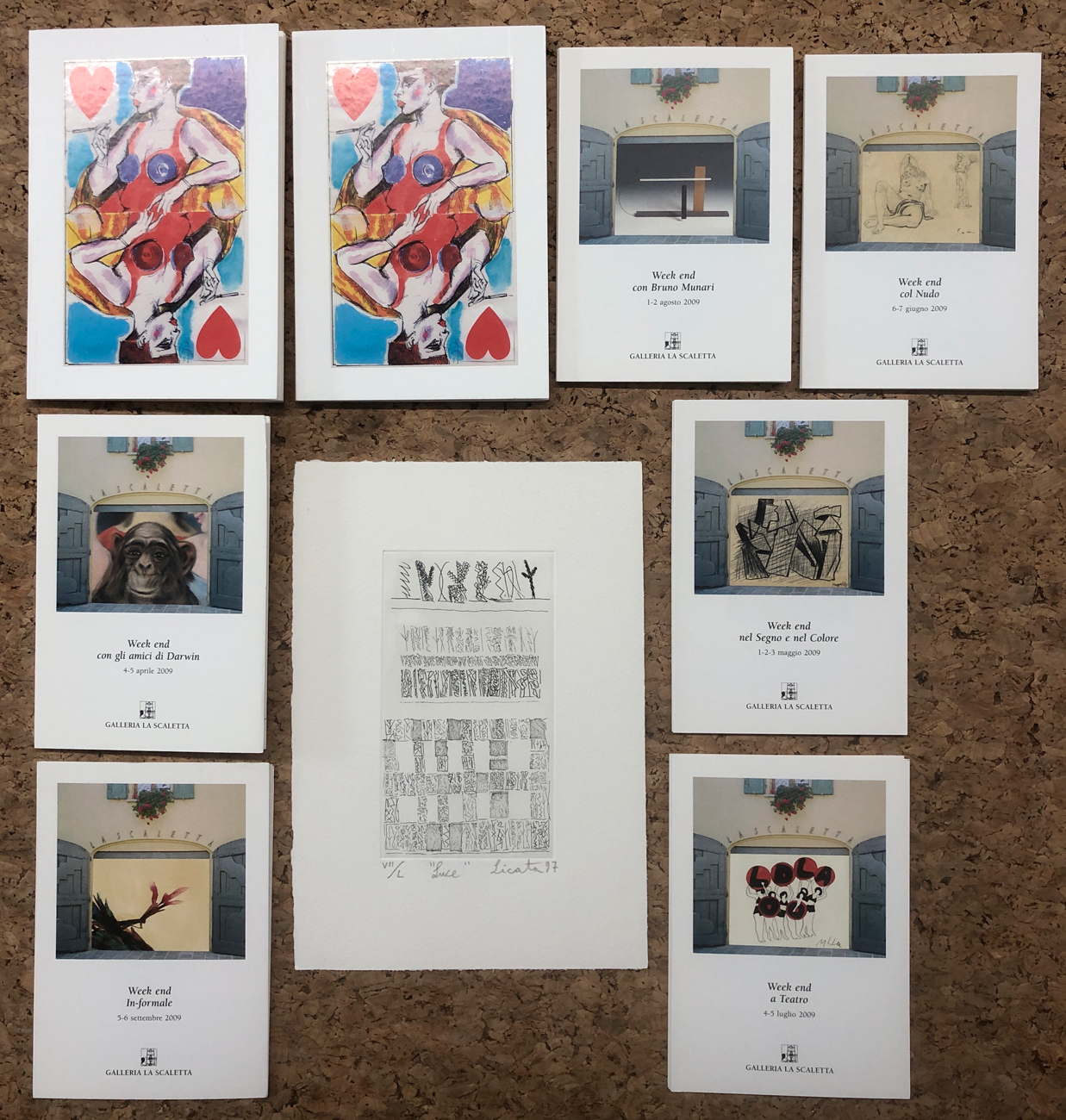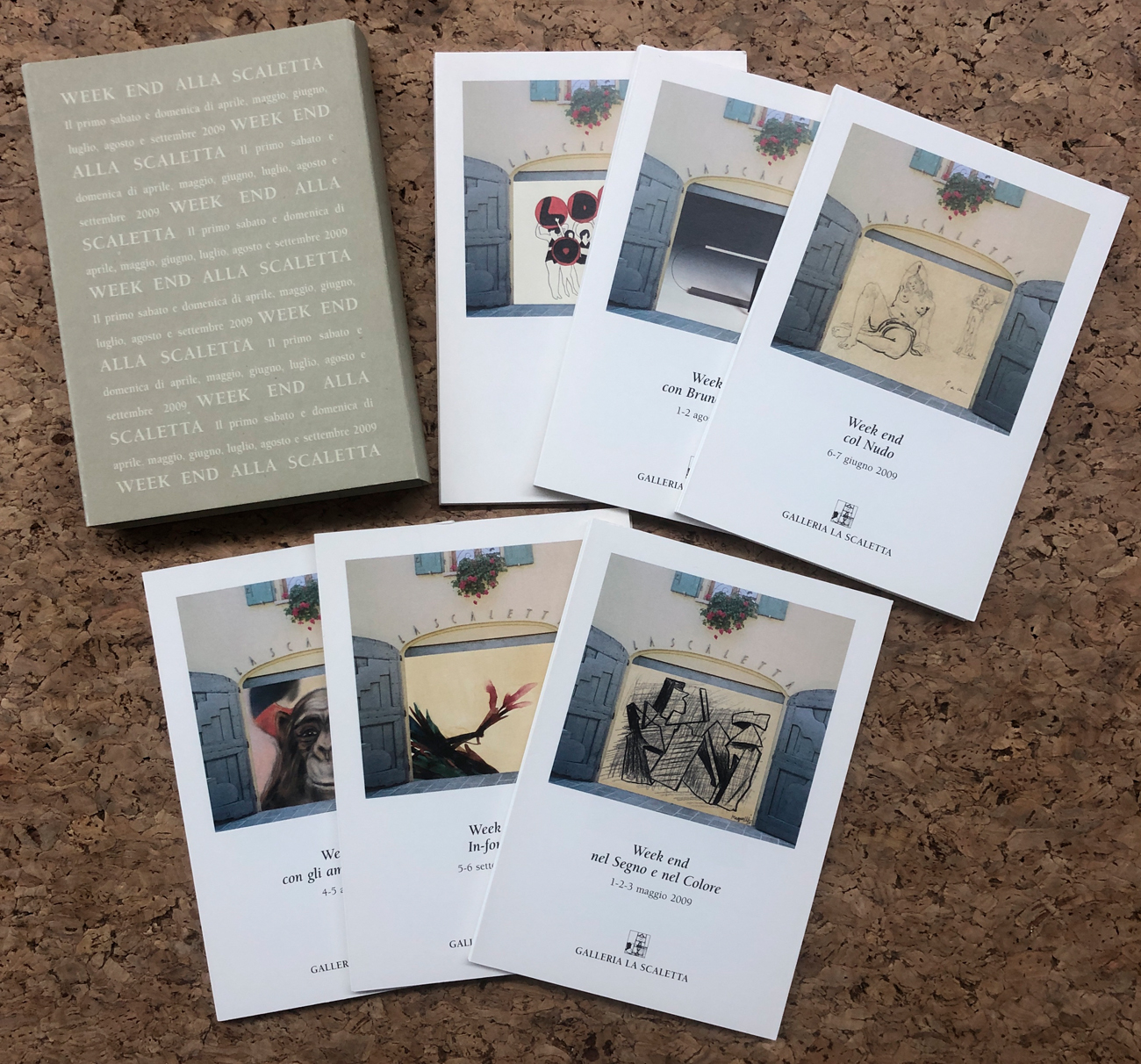 Piccolo cofanetto contenente 6 cataloghi riccamente illustrati con apertura a fisarmonica (Week end a Teatro, Week end col Nudo, Week end nel Segno e nel Colore, Week end con Bruno Munari, Week end In-formale, Week end con gli amici di Darwin)