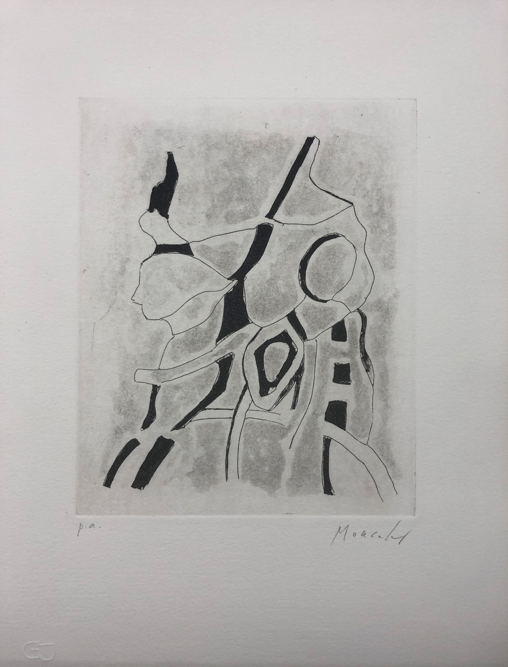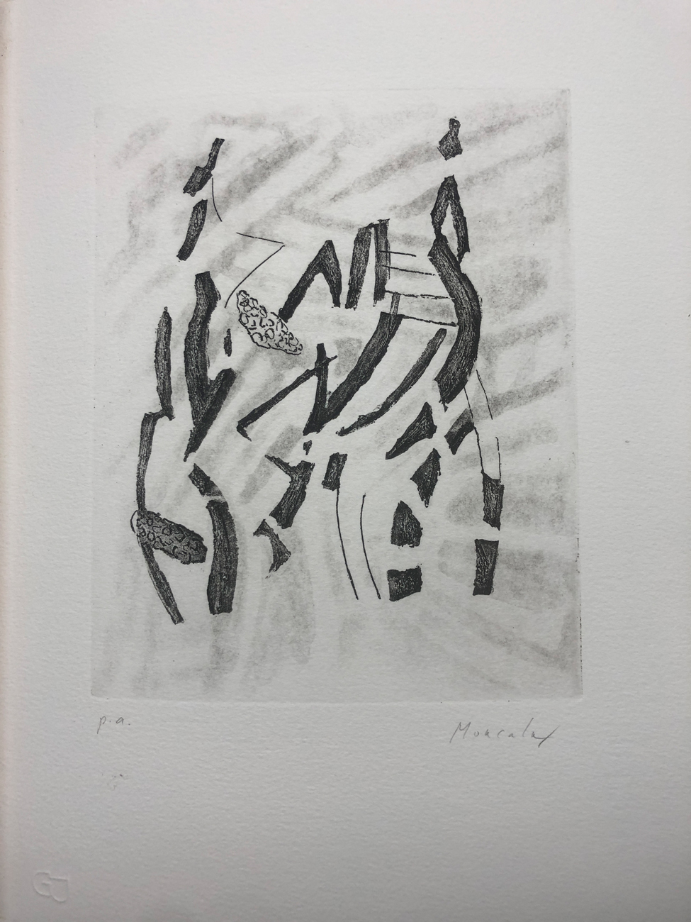 Libro d'arte con poesie di Marica Larocchi, lettura di Stefano Agosti e due acquetinte originali di Ignazio Moncada, ciascuna recante firma e numerazione (Esemplare p.a.) a matita al fronte e timbro a secco di Giorgio Upiglio